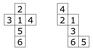 Tehtäväsi on selvittää, mitkä arpakuutiot ovat samanlaisia. Arpakuutiot ovat samanlaisia, jos toinen arpakuutio voidaan asettaa sellaiseen asentoon, että kummankin arpakuution vastaavilla tahkoilla on samat numerot. Huomaa, että tässä ei oteta kantaa siihen, onko tahkon numero kirjoitettu oikein päin.