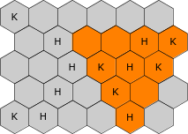 Seuraa k riviä muotoa a b c: rivillä a sarakkeella b sijaitsevassa kuusikulmiossa on saalis c. Saalis on joko merkki H eli hauki tai merkki K eli katkarapu.