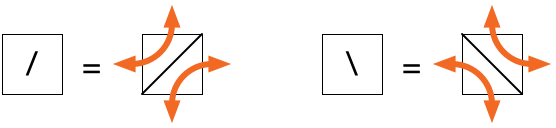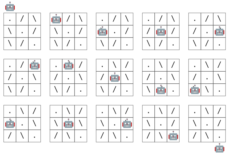 Jokainen ruudukon ruutu on joko tyhjä ruutu (.) tai käännösruutu (/ tai \).