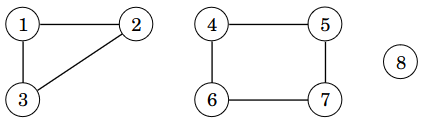 Tehtäväsi on muodostaa annetun verkon kaikki komponentit listoina. Esimerkiksi seuraavassa verkossa on kolme komponenttia, jotka ovat [1,2,3], [4,5,6,7] ja [8].